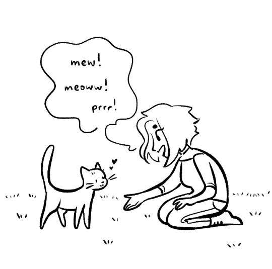 when we try to befriend cats we mimic their meows and get down on the ground to their level and try to gently coax them to interact with us right