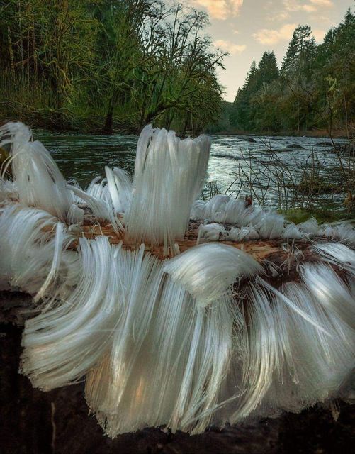 Have you ever seen “hair ice?” “Hair ice” or “bearded frost” is rare and occurs only in a small percentage of the world (it’s not Hoar Frost). Hair Ice grows specifically on the decaying wood of an Alder tree branch & is caused by a fungus living within decaying wood. The fungus “breathes” or releases its spores pushing the moisture out of the wood’s pores, causing it to immediately freeze. The small hole is as thin as a strand of hair thereby causing the hair-like ice to form.