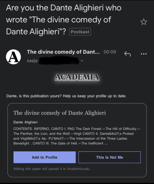 Throwback to when I put my name as Dante Alighieri on Academia.edu and received this email