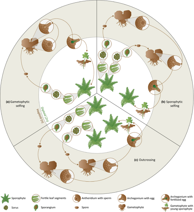 This image shows sporophytic selfing, where the big asexual fern makes little sexual ferns without breeding (since it has no sperm or eggs); outcrossing, where the little sexual ferns breed with others to make big asexual ferns; and gametophytic selfing, where one little sexual fern makes big asexual ferns by breeding with itself (a sad world).