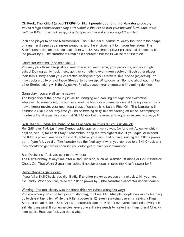 Making a shitty one-page RPG called Oh Shit It’s the Killer. The premise is simple: you’re a high schooler spending the weekend in the woods with your besties. The Killer is there also. He is trying to the Kill you