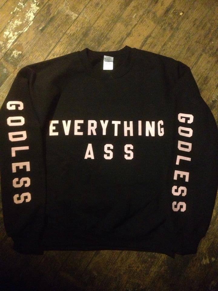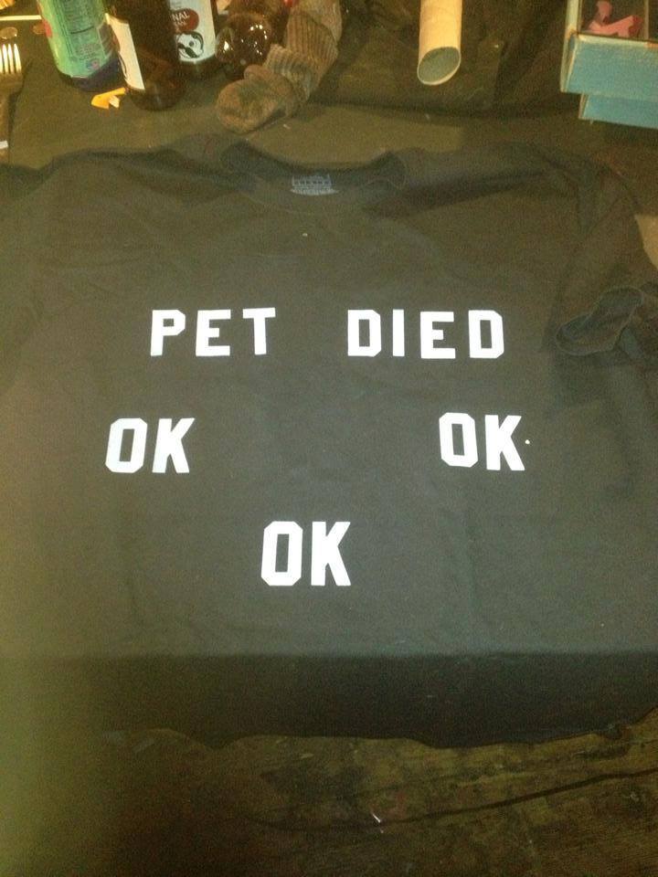 in my sophomore year of college this guy made these items which quickly became a craze across campus. i myself bought one of his sweaters, which says “GOOD AND DEAD” across the chest and “ARM PAIN” along the sleeves. he showed up at 11 pm on a bicycle to deliver the goods in the dead of winter, wearing a metal t-shirt tucked into khakis. his facebook screen name is an indecipherable series of symbols. i have no authentic way to credit him but i want to share his art with you.