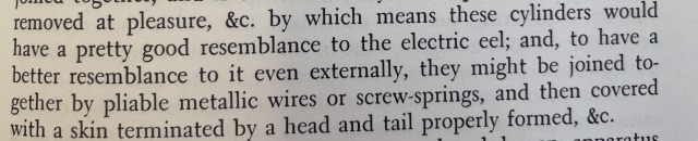 “…by which means these cylinders would have a pretty good resemblance to the electric eel … they might be joined together by pliable metallic wires or screw springs, and then covered with a skin terminated by a head and tail properly formed, &c.”
