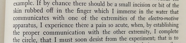 He wrote pages on painful experiments with the artificial electric organ – touching it, poking it into his eyes and ears, making other people touch it, generally just shocking the ever loving hell out of himself over and over. He routinely shocks himself so hard that he has to take breaks. And of course, he licks it.