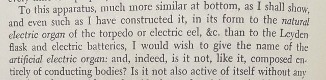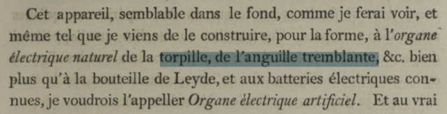 “To this apparatus … I have constructed it, in its form to the natural electric organ of the torpedo or electric eel, &c, than to the Leyden flask and electric batteries [battery = linked Leyden flasks], I would wish to give the name of artificial electric organ.”