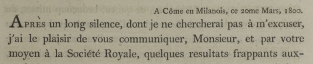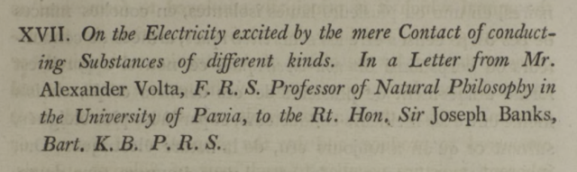 Surely, if Volta modeled the pile after electric fishes, I’d be able to find a citation! Wikipedia is usually a good place to start when hunting primary sources, but no luck. No mention of fish at all. I trust fishteriously more than wikipedia, however, so I went digging. Looks like Volta first reported his discovery in a Letter to the Royal Society in 1800.