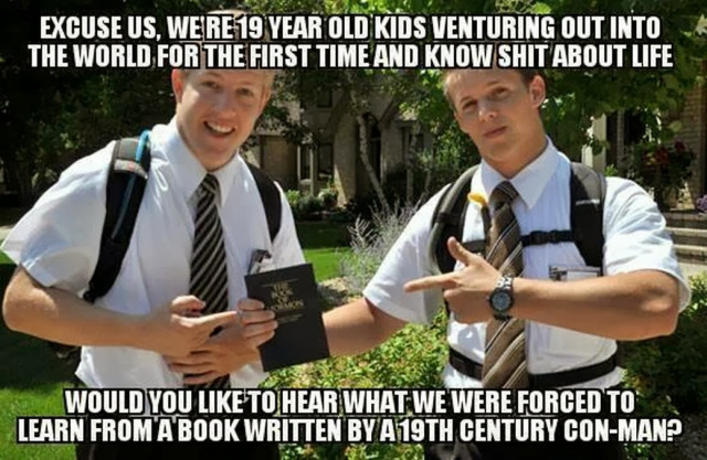 It’s sometimes hard to be nice to people who seem to represent something you dislike. Just remember these “elders” are sheltered young men, some of which are getting their first real contact with people of other/no faiths.