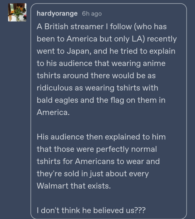 in conversation about white people who go to Japan and expect their knowledge of anime to culturally carry them, I was once posed with “it’s like if there was a Japanese guy who was obsessed with spongebob and came over here and thought he could get by just communicating in spongebob quotes.” This is a false equivalence because if such a man existed we would crown him king. We’d love him. Americans would fucking love that. sometimes I get sad that this isn’t a real guy I can invite to a party.