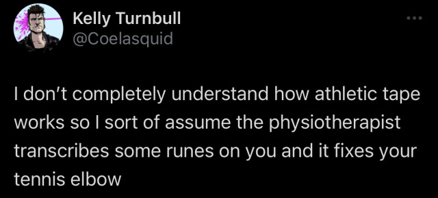 this is literally correct. im so mad that i cant find it right now, maybe i will later, but a few months ago i read a paper that was a report on a survey of k-tape use by sports medicine people and physical therapists, and 70% of them reported that they knew/had observed that k-tape does absolutely nothing, but that athletes are so superstitious that the PTs would use the tape anyway because it improved performance via placebo. the majority of studies on k-tape are either inconclusive or a very definite “this does absolutely nothing”.