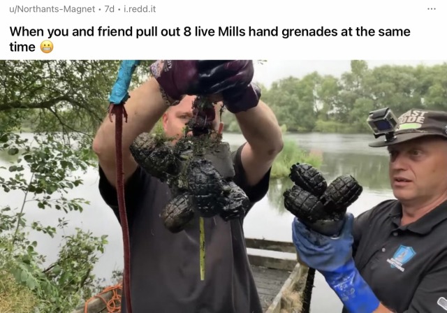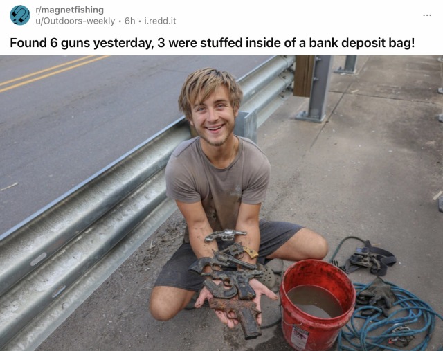 I love r/MagnetFishing. Every time I go in there it’s wall-to-wall bags of bullet casings and uneasy laughter. Just a bunch of guys who made a hobby out of breaking into nursing homes for retired murder weapons.