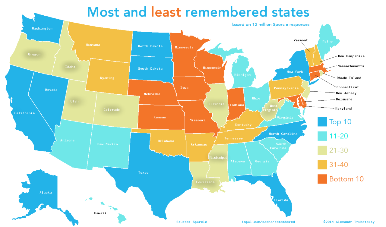 Most and least remembered US states atrubetskoy: This map shows which states are the hardest and easiest to remember,...