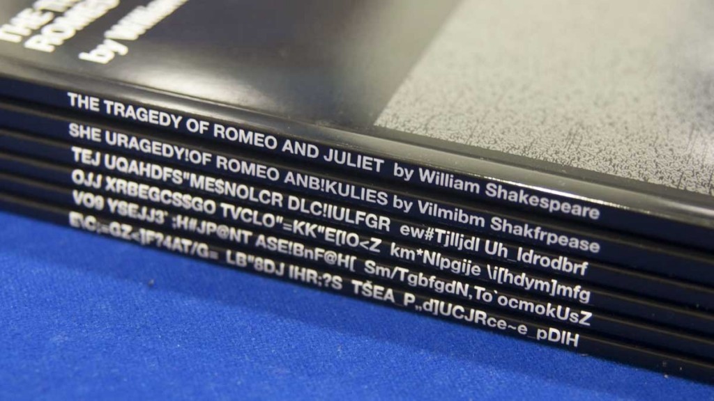 six different versions of the tragedy of romeo and juliet by william shakespeare in six books. each book, except for the one that includes the original work, is obtained by applying to the text the jpeg compression algorithm at different quality levels. the cover shows the jpeg image including the altered text.