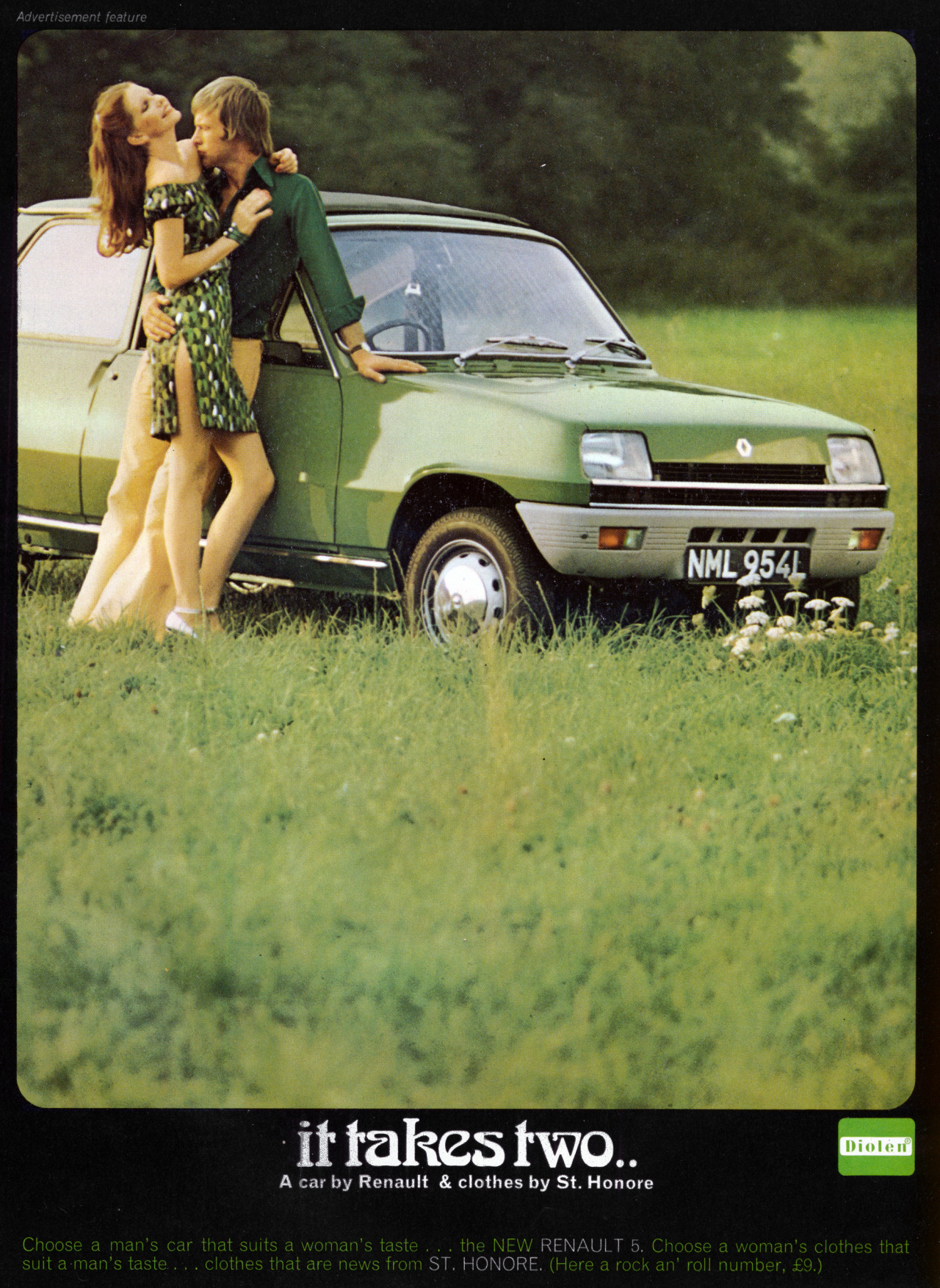 Advertisement feature for Renault and St. Honore, Cosmopolitan, November 1972Photography by Anthony Horth