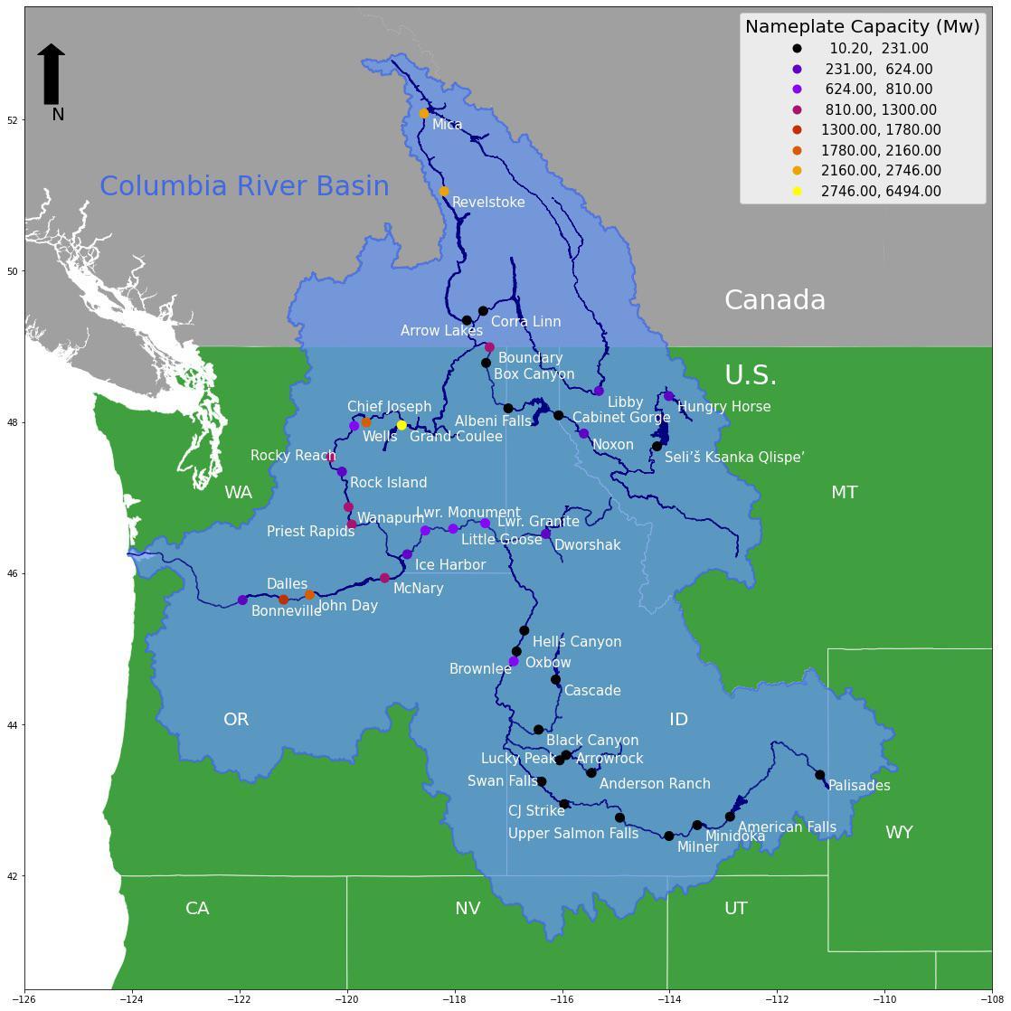 Columbia River Basin Watershed With Distribution of Hydroelectric Facilities and Their Respective Nameplate Capacity