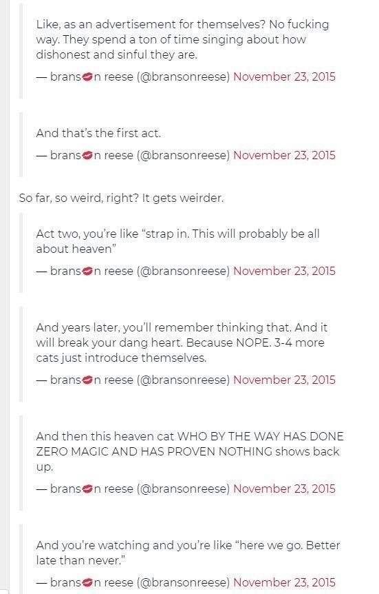 By contrast, the Taylor Swift-written song is like the most Taylor Swift song, uses all her standard writing tricks and her little-poor-me outside-looking-in perspective. Not to mention it is the defining song for Victoria, the new central viewpoint character (and Taylor is clearly ventriloquizing her vocal approach), so it claims basically the entire movie for her, specifically appropriates Grizabella’s pathos for herself, and steps on the last line of Memory with a callback.