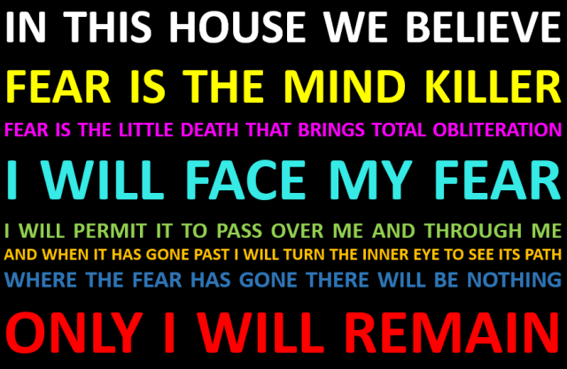 The head Space Nun gives Paul a test, it’s like “stick your hand in this box and it’ll feel like the worst thing possible, if you take your hand out I’ll kill you with my poisoned ring.” Fear is the mind-killer. Fear is the little death that brings total annihilation. Paul doesn’t pull his hand out and she’s like “well done, chosen one”.