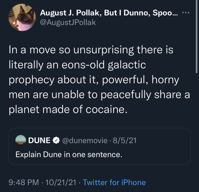 Arrakis is changing hands! It’s a desert planet, and House Harkonnen used to own it but just now the Emperor gave it to House Atreides! It’s a fucking terrible place to live but Spice comes from there and Spice is some hot shit!