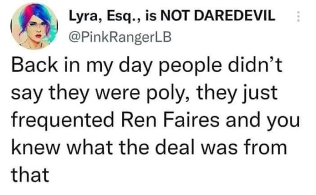 I was doing a renn faire (and going to the hotel jacuzzi afterparties) back in the late ‘90s, and reading '70s SF before that, it’s nothing novel to me. The problem with polyamory is polyamorists. I remember setting up my OKCupid profile and saying I’d consider it and it took another hundred questions before my matches were remotely acceptable again. Maybe if it ever caught on among the sane and attractive.