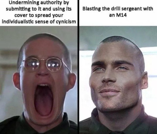 One thread of Full Metal Jacket is about the media supplanting religion as the filter through which man understands the world – closing with the victorious men staggering off singing the Mickey Mouse Club theme as a hymn. Joker’s role in the Marines as cynical journalist is chaplain.