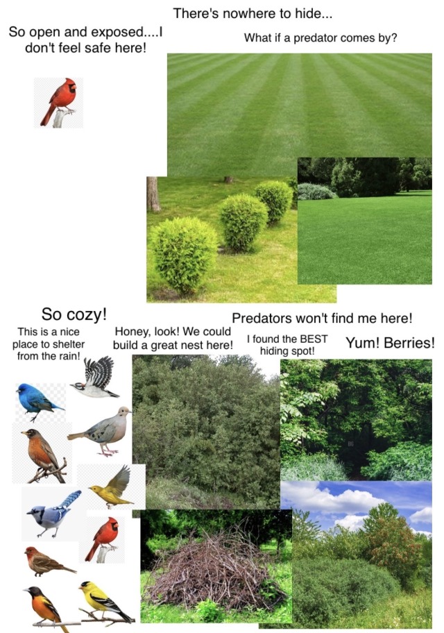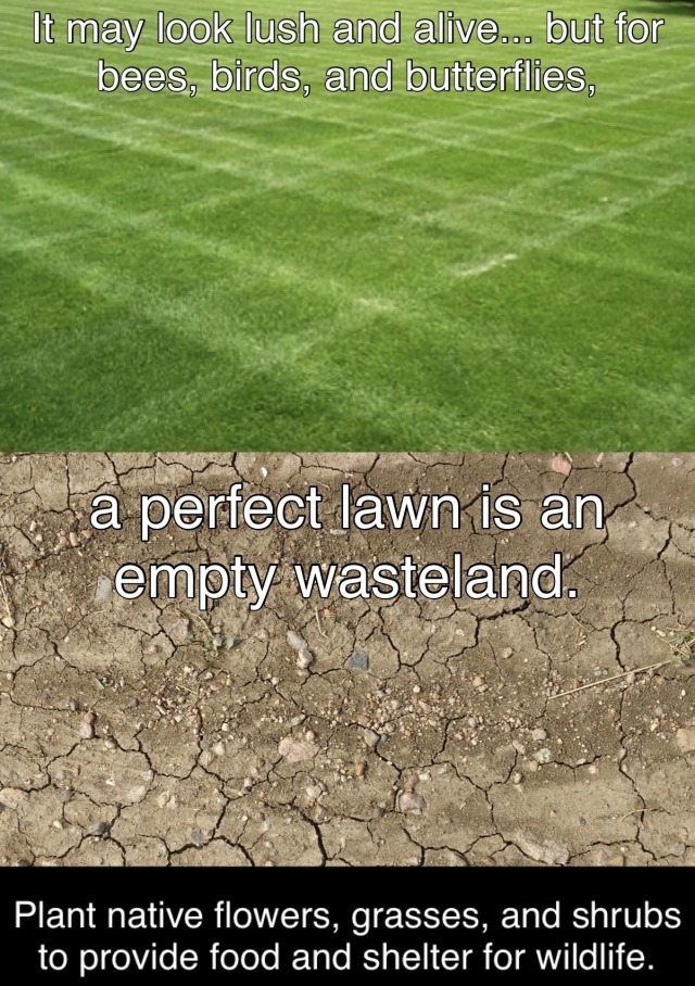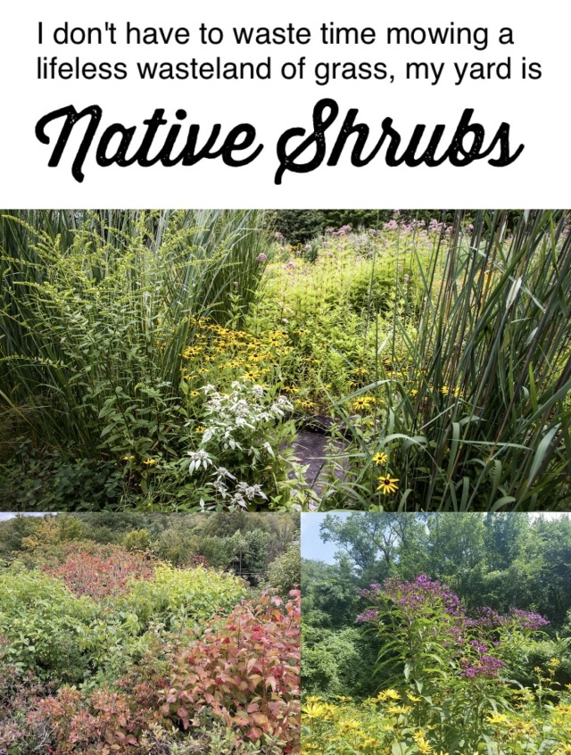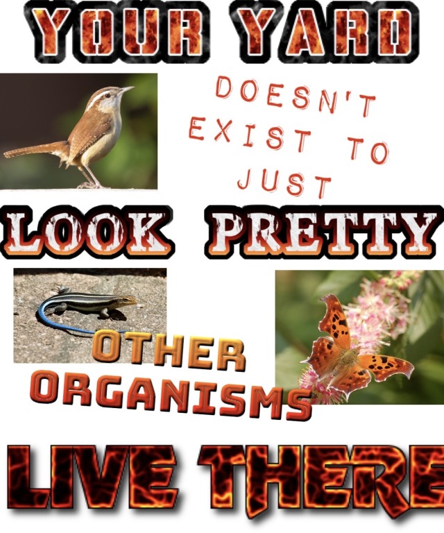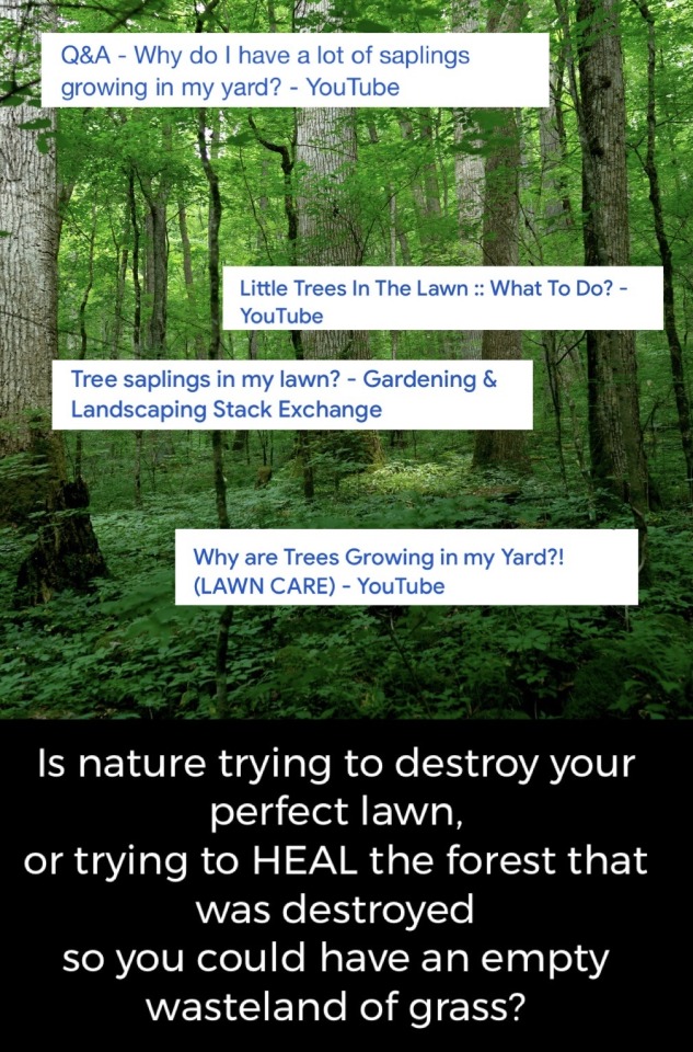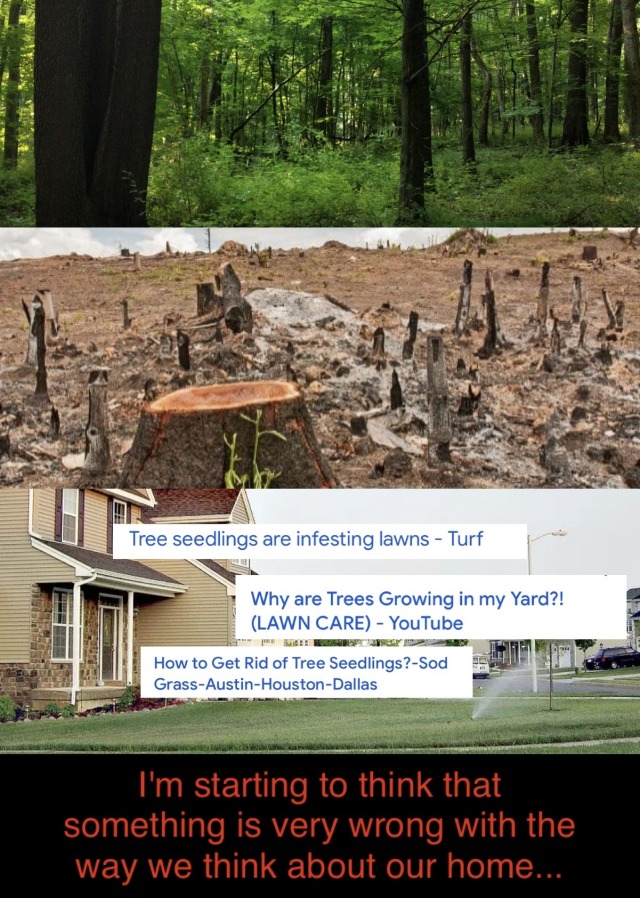 This is what I get to look at out the window. When I moved in that woodchip path was mud, there was a tangled stand of so many trees of heaven their (also tangled) roots put out enough poison to kill grass, both sides of the path (the far side is wildflowers now) AND the ledge within the retaining wall were overrun with dandelions, deadnettle, nettles, other broadleafs, bittercress, seafoam, and crabgrass, a thick tangle of blackberry canes hung off the fence on the other side of the chimney, that bush in the foreground was grown high enough to block the window, and the trees had a ton of thin, twisted, dead, witchy branches at window level and an overgrown carpet canopy up above blocking light and making the whole area look like a cartoon haunted forest.