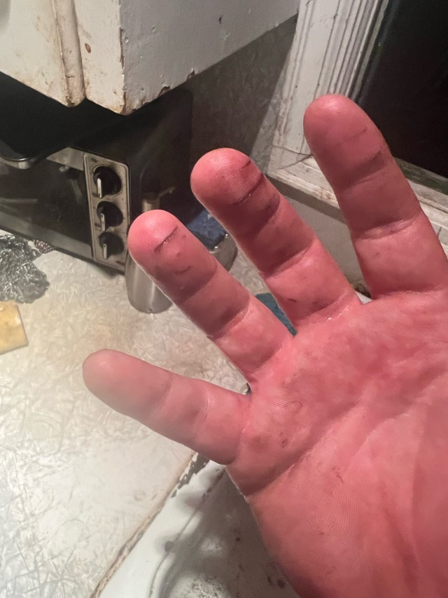 I have opened up slashes on the pads of most of my right fingers by grabbing things wrong while my skin is suddenly tight in a way that might be related to how the testosterone is supercharging my muscle growth