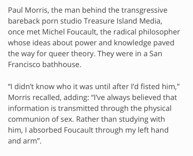 Added to that one professor at Cornell, this makes two men I’ve heard of citing their continuity with Michel Foucault by reference to having had their fists up his ass
