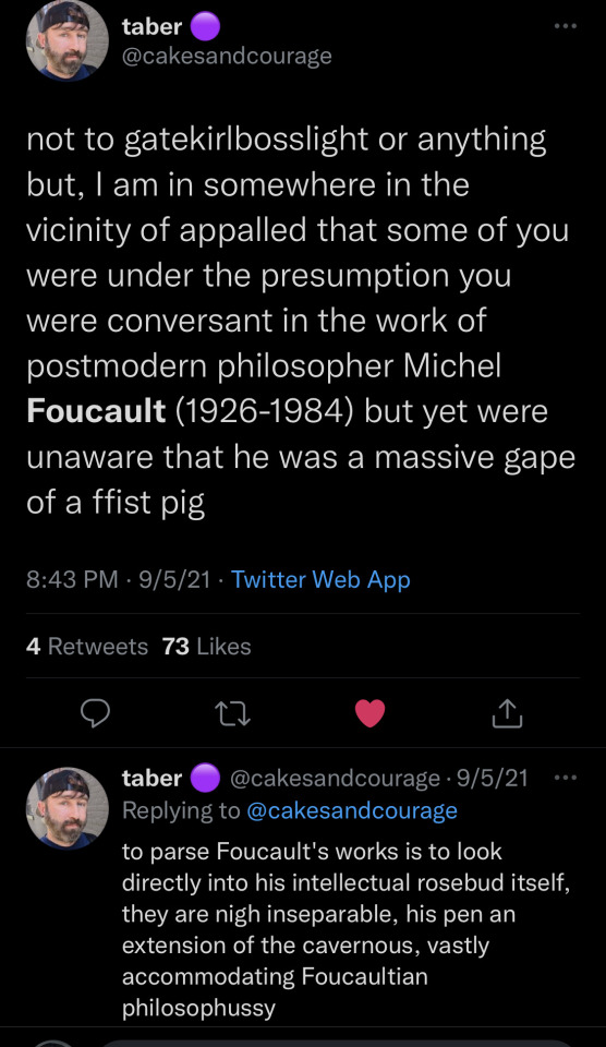 in the end, it turned out the thing with letting the academy reorient itself around queerness was not everyone is as committed to honest philosophy in the Western tradition as Michel Foucault