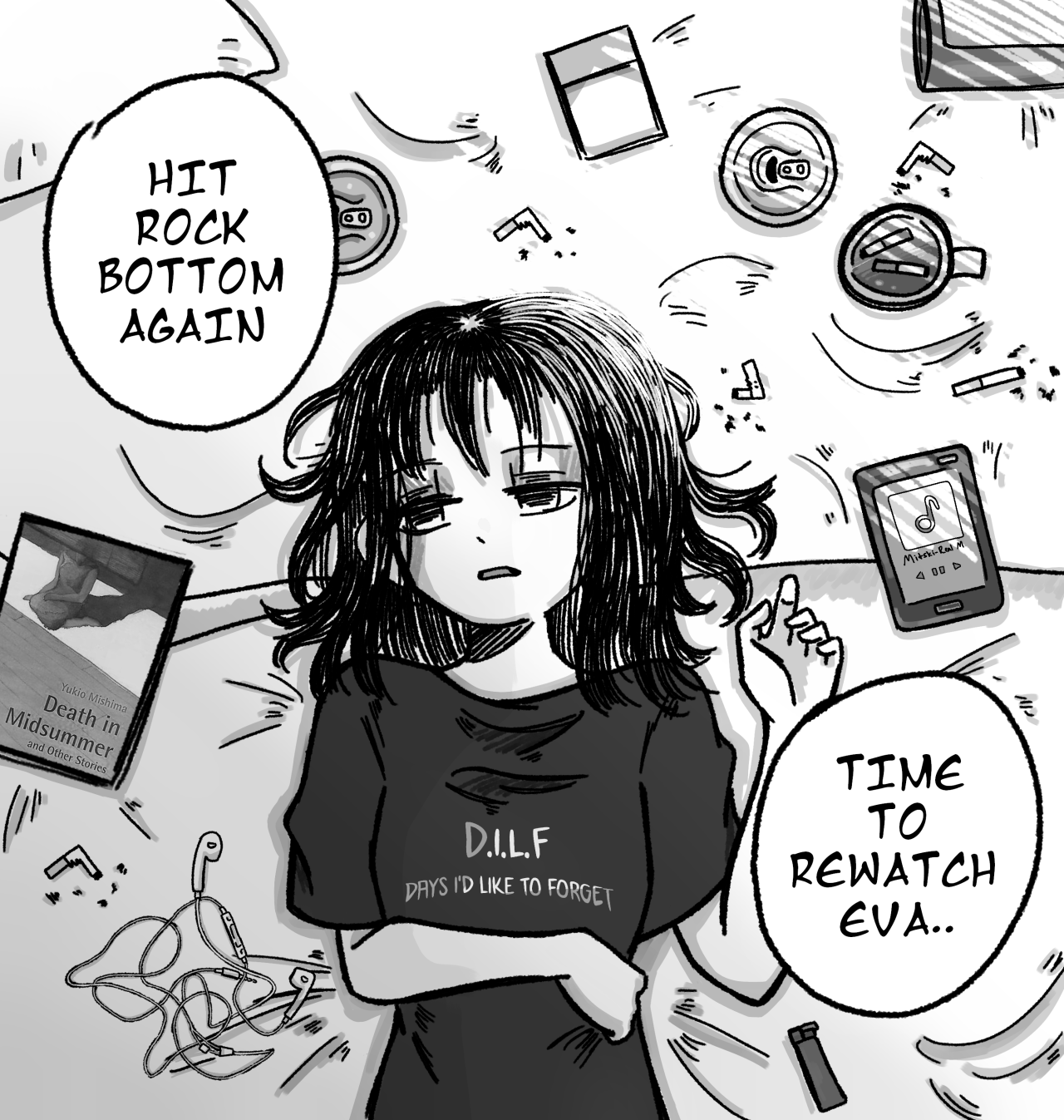 This got elevated to tablet background for inscrutable reasons, so it deserves a reblog - I think its the Death in Midsummer that really gets me, it goes from generic emo-weeb-waif to this fucker knows, man. They’ve seen the other side of their own despondent vibe, they are all-in and aren’t coming back.
