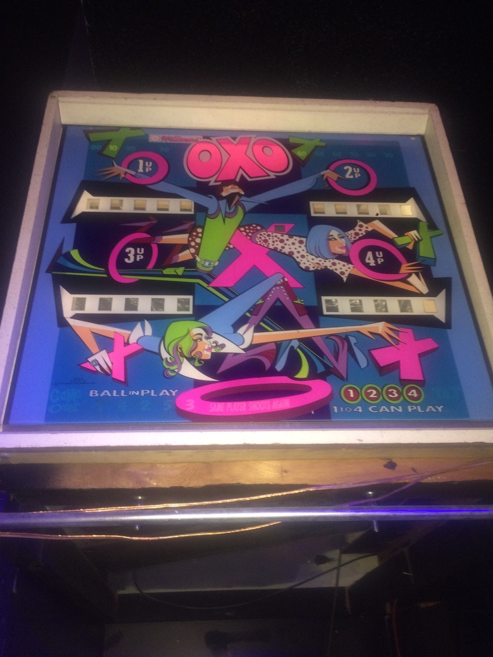 A pinball table that had been operated on location in Alaska. When the plastic flippers and drop targets broke they were replaced by functioning hand carved wooden replicas.