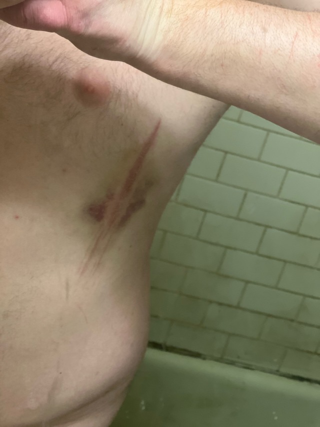 The wound from when a branch knocked me down into a rose bush is interesting