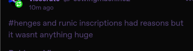 other stuff i think is usually or often just stuff people did for no reason or for reasons so esoteric they are functionally meaningless: most paleolithic art. most runic inscriptions. many henges of various kinds. most large scale modern day art mysteries including the Toynbee tiles. the guy who made a huge throne in a storage locker out of candy wrapper foil. Henry darger’s work but in a complicated way i can’t really explain. DEFINITELY the voynich manuscript like i take one look at that thing and immediately think “a weird guy had a nice time on this project for his own personal amusement” like that is the vibe absolutely.