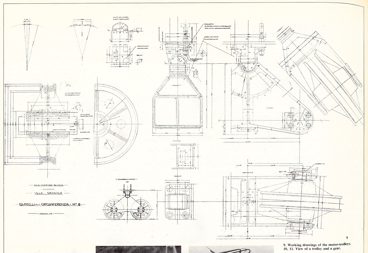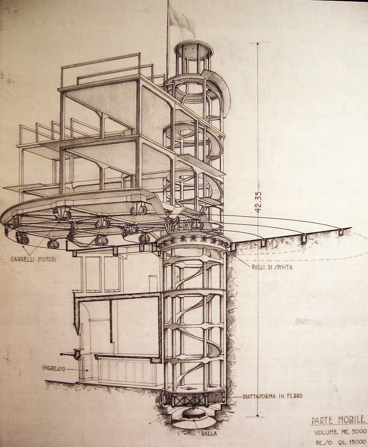 Gears and mechanical revolving system. Villa Girasole. Angelo invernizzi. 1935 Detail plan. Villa Girasole. Angelo invernizzi. 1935 Main concrete structure. Villa Girasole. Angelo invernizzi. 1935 Floor Plan + Section showing mechanical revolving system. Villa Girasole. Angelo invernizzi. 1935