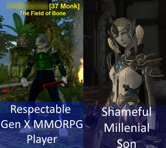Nothing quite demonstrates the generation divide like how both me and my dad are/were MMORPG players, both of us play lizardfolk monks, but in his case in Everquest the Iksar were legit humanoid lizards whereas mine is an Au Ra kawaii uguu anime girl with a few patches of scales and horns