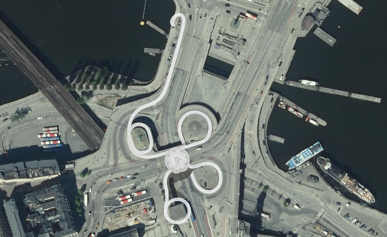 An elegant steel construction embraces and extends the existing cloverleaf interchange. The different parts of Slussen are connected by heated pedestrian walkways and intermingled with the light organic shapes are observation decks, cafes and a two lane tunnel.”