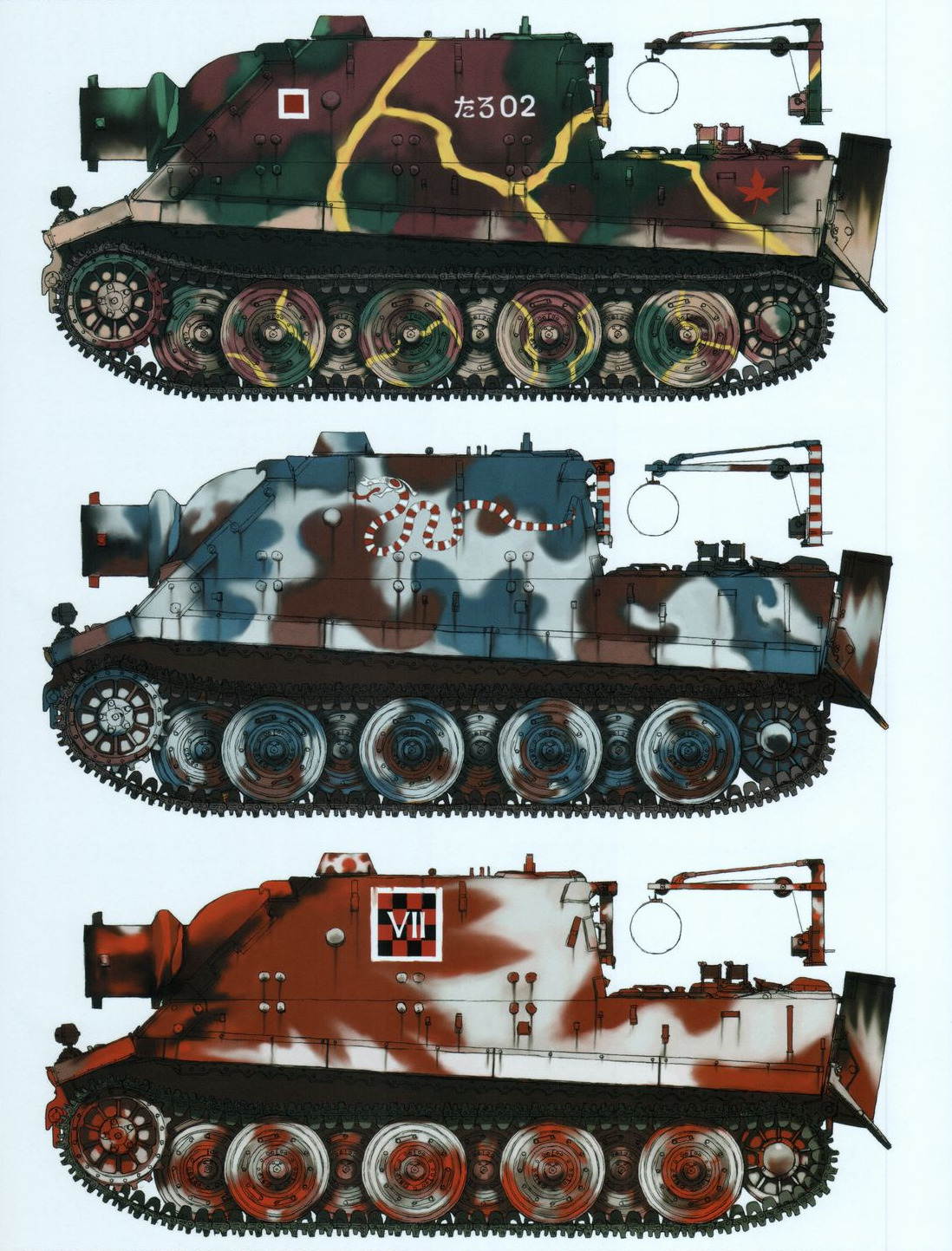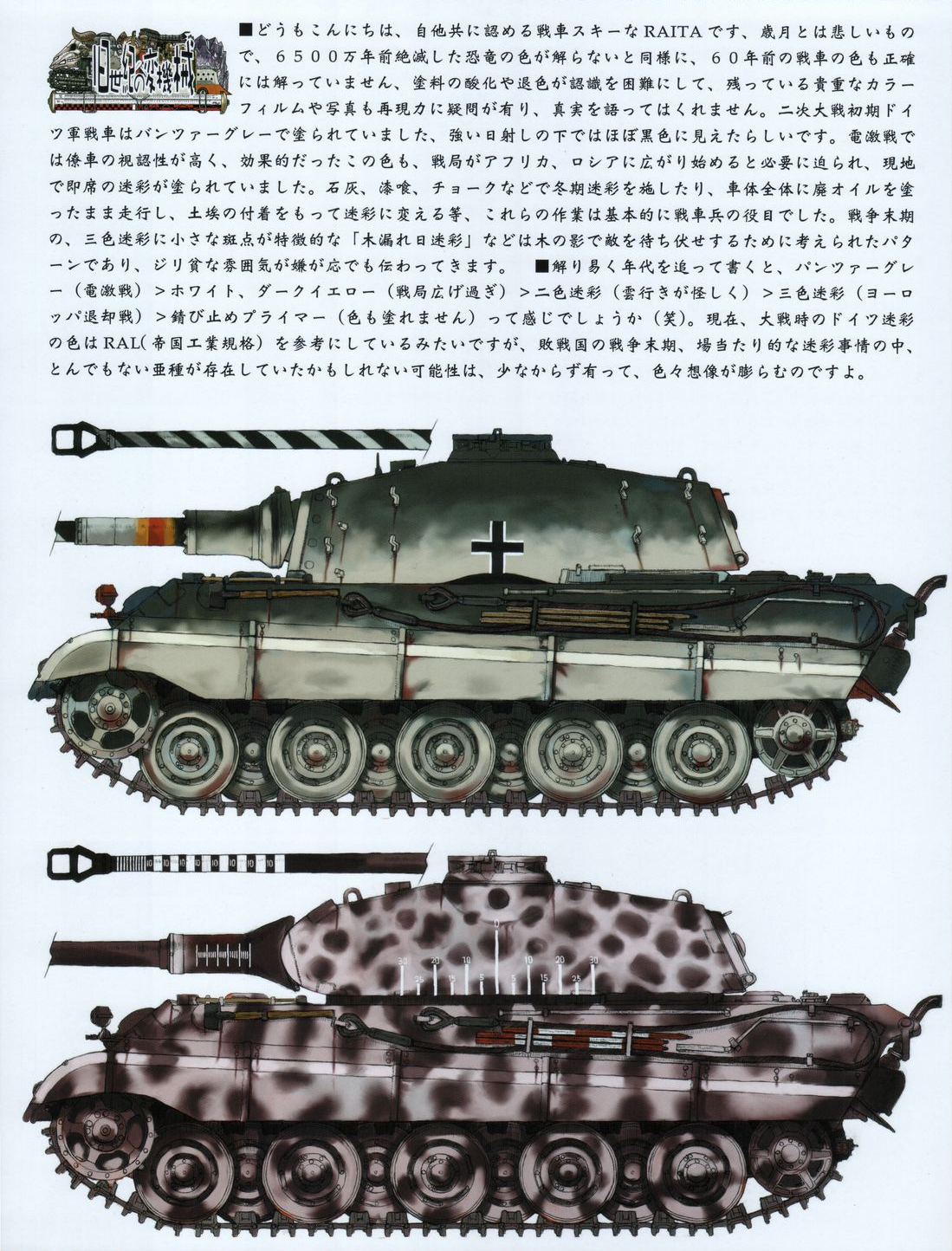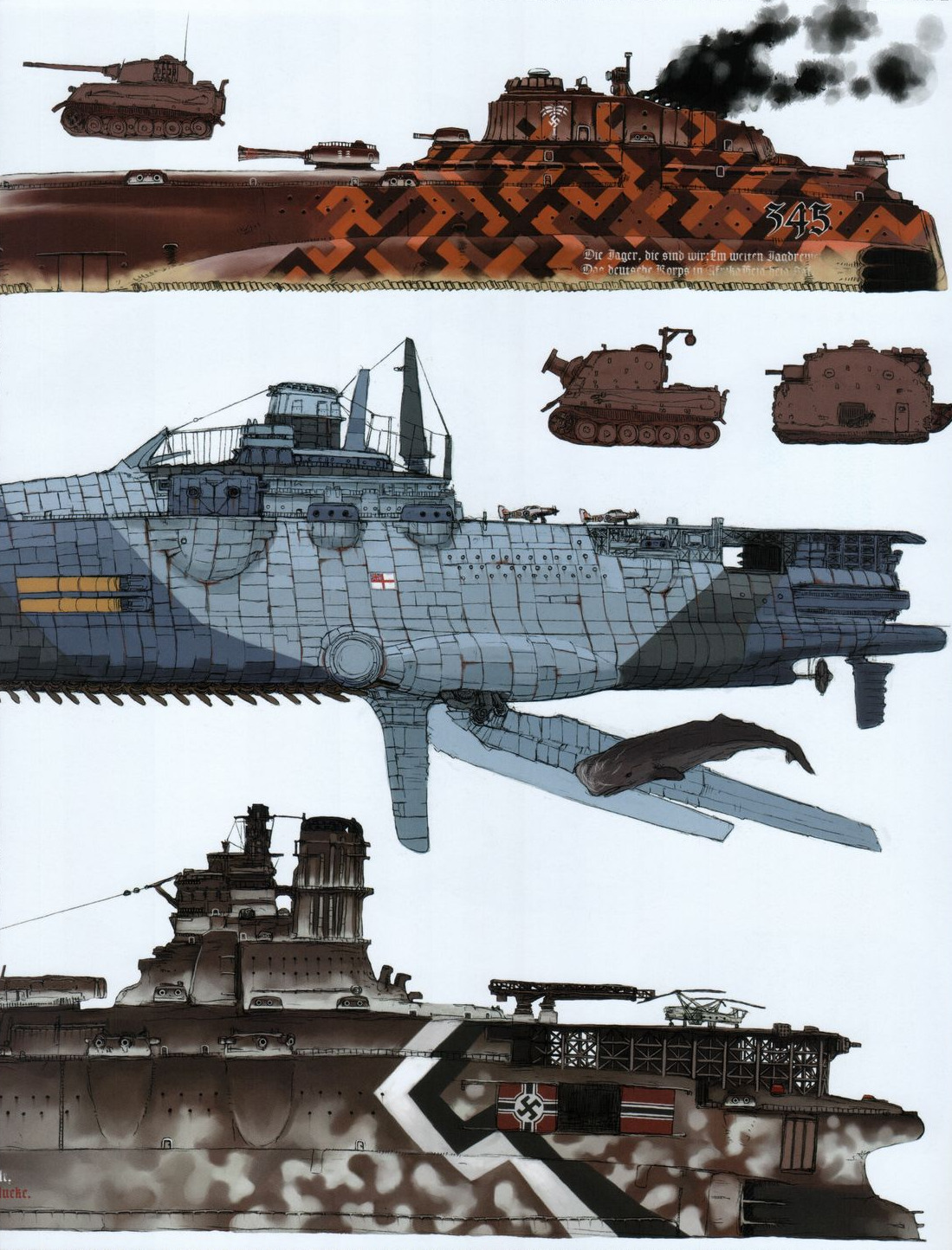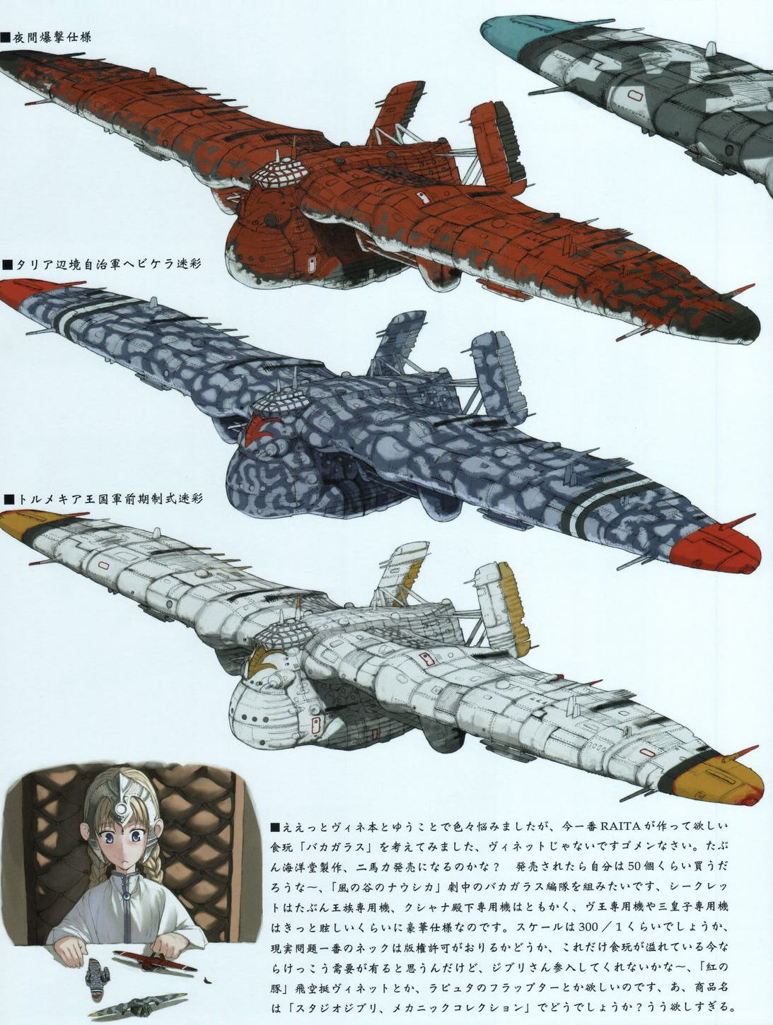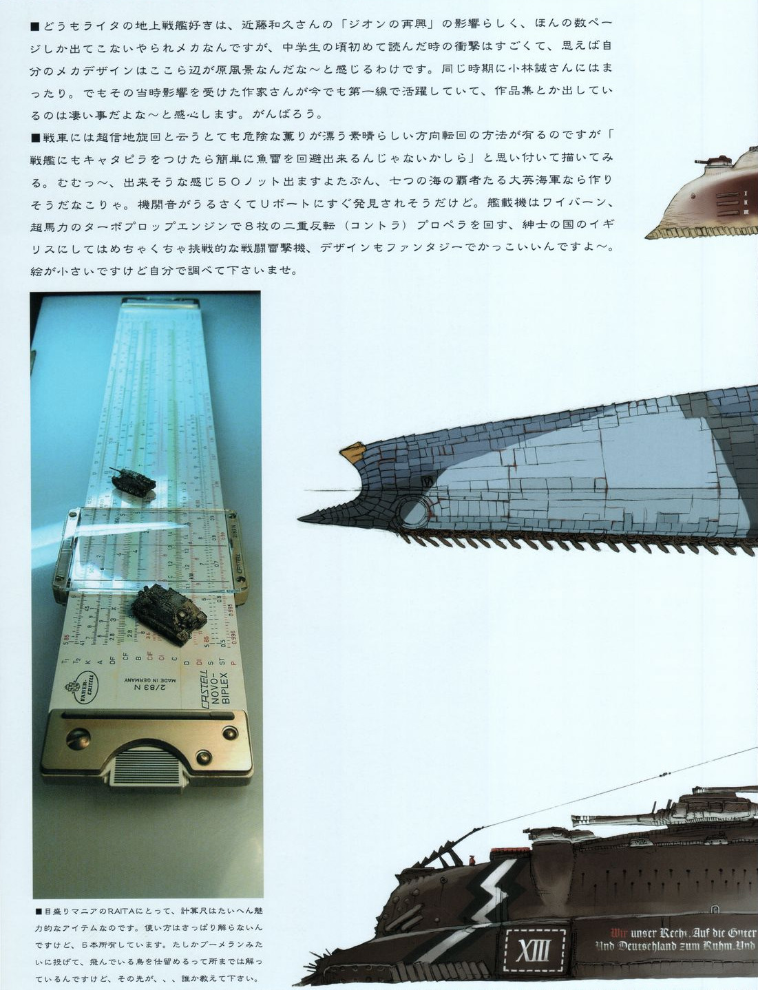 Various vehicle designs from Raita Honjou’s 2006 doujinshi called “Raita’s Militaria”. The tanks are very reminiscent of his work on the Valkyria Chronicles series and the blue battleship reminds me a lot of the Centurion from VC4. The airplanes also seem to be variations on the Tolmekian airships from Nausicaa of the Valley of the Wind.