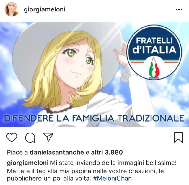 anyone remembers that time homophobic fascist italian politician giorgia meloni was asking for “manga fanarts” of herself and some genius sent her a picture of lesbian icon mari ohara and giorgia liked it so much she used it for her anti-gay marriage campaign about “traditional family values” and tagged it #melonichan on instagram? just me?