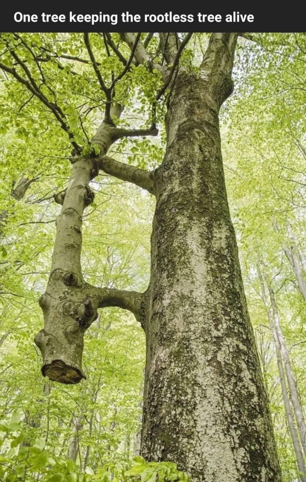 Trees will share so much of their resources, they’ll even keep trees alive that are almost entirely dependent. Like this tree! The tree above is getting some energy from its leaves, but no other nutrition of its own. And it wasn’t able to link up to the shared root system. So the other tree reached out and hooked up to it directly, feeding it all of the nutrients it needed!