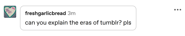 i think the eras of [tumblr] are fairly vague but can pretty much be defined as: