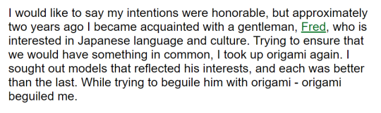 Or how Sarah’s Origami page tells us she picked it up as a seduction technique to get into weeb-master Fred’s good graces on its literal intro, which is the cutest and she should be immensely proud of this even 24 years later, I hope she is: