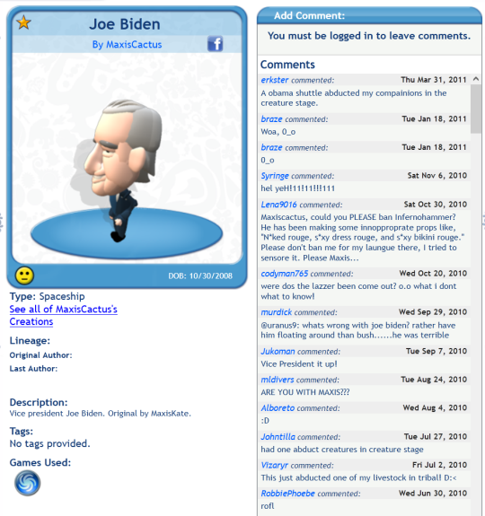 I know this is a longshot but I feel like Tumblr is the best place to ask- does anyone have the official Joe Biden Spore file? I have not been able to find it on the old Sporepedia links that I found.