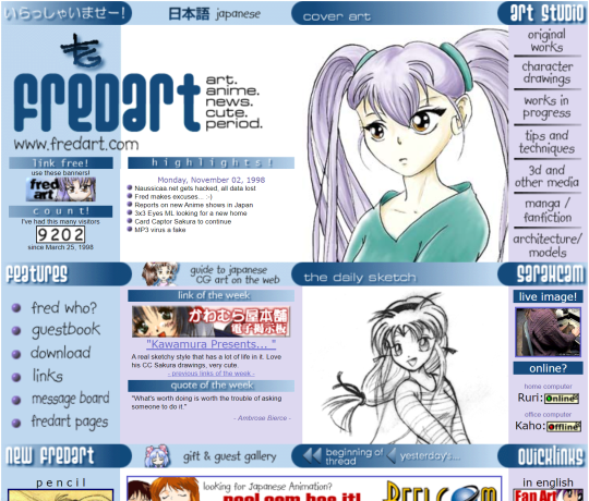 So someone linked an upload of some really early anime websites that got loaded on CDs… from a magazine? That would include as a bonus to subscribers?? Archived versions of fansites on the CDs??? Which is just, amazing on so many levels, but is a real bonus for us. One of the linked early fan sites is Fredart.com, Megatokyo author Fred Gallagher’s pre-webcomic site on anime news and his personal art. (Really having a lot of Megatokyo Baader-Meinhoff these days)